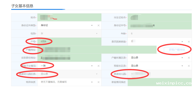 (带圈的是自动完成的信息,输入姓名,身份证,户号,点击“获取户籍地址”,就会自动填充完成。而且不能更改。)