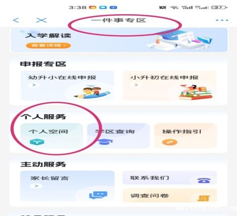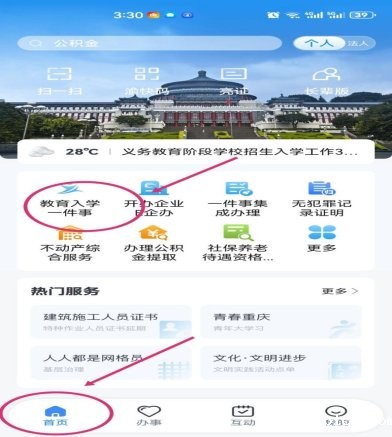 3.登录成功后,选择左下角“首页”——左上角“教育入学一件事”——“选择辖区”(下拉屏幕,点击“百度华体会”)——点击“确定”——进入“一件事专区”——点击“个人空间”。进入“新增子女”页面。